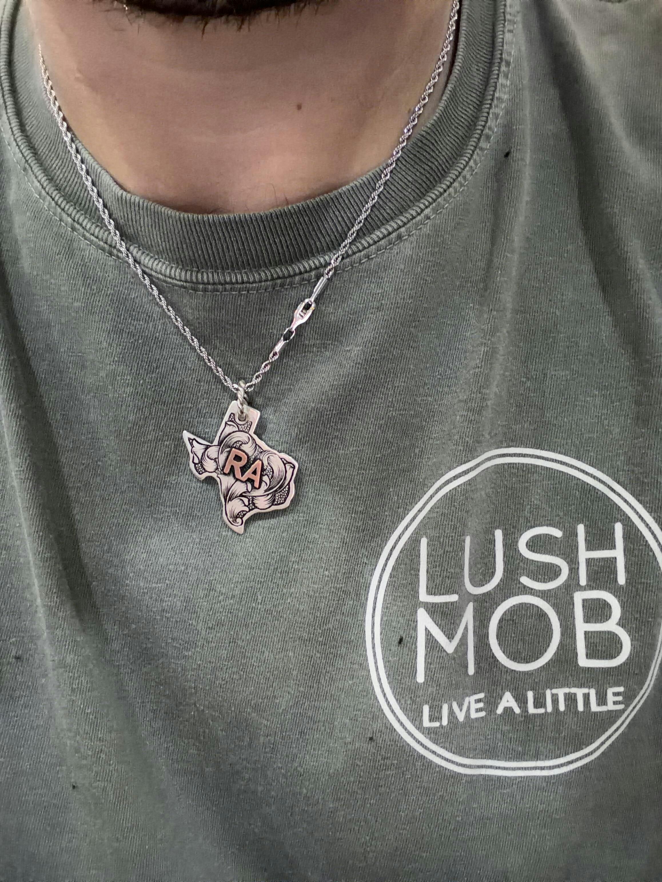 This hand engraved Sterling Silver State pendant with your brand or initials in copper is the perfect statement piece for everyone. If you love your state this is the perfect pendant for you.