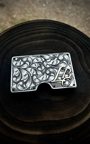 These Custom Card Wallets with money clip are fully engraved on one side with Scrollwork and a beaded background and customizable with your Brand/initials in copper!